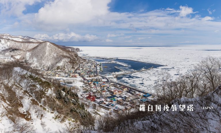 北海道道東知床半島東側、面向根室海峽並與國後島面對面的羅臼,是觀賞鋪天蓋地的流冰奇景與上百隻的虎頭海鵰與白尾海鵰的最佳地點。而位在高點的羅臼國後展望塔,更可以從山丘上的位置,俯瞰羅臼漁港與流冰奇觀。車子沿著山路盤旋而上,抵達後再爬上階梯來到展望塔頂部,突然之間視野一下子打開,羅臼漁港、羅臼岳、知床的山地及國後島一覽無遺,當然還有那最重要的、把整個羅臼沿岸都填白的滿滿流冰啊!從高處更能夠看到流冰範圍之大,也更加感動於大自然的偉大與神奇。