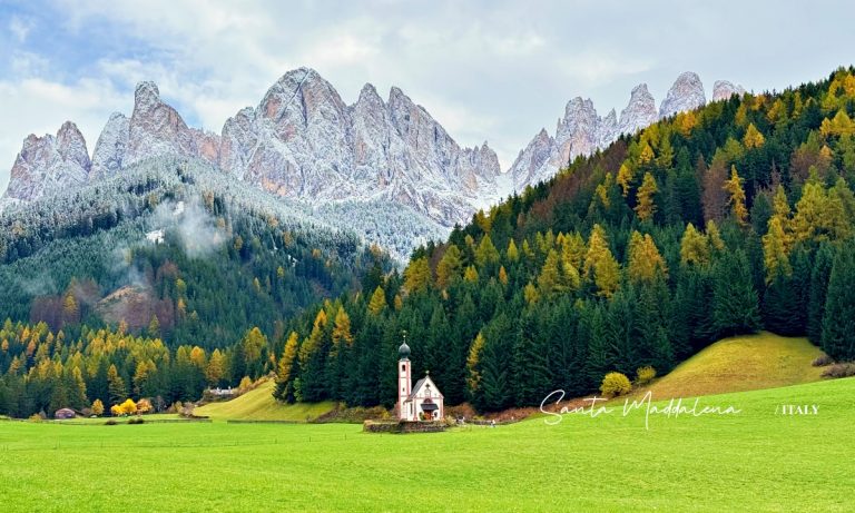 Val di Funes 富內斯山谷 (德語 Villnößtal) 是多洛米堤山區中最富盛名的景點之一,綠草如茵的大地,蒼翠茂盛的樹林,遺世獨立的教堂,搭配一整排的白雲石山峰,吸引著無數攝影愛好者來此取景。其中夢幻的村莊 Santa Maddalena 聖馬達萊娜 (德語 St. Magdalena) 更是令人醉心。我們在最美的秋季時分來到富內斯山谷中的聖馬達萊娜,天堂般的阿爾卑斯田園景致,永遠烙印在心裡。